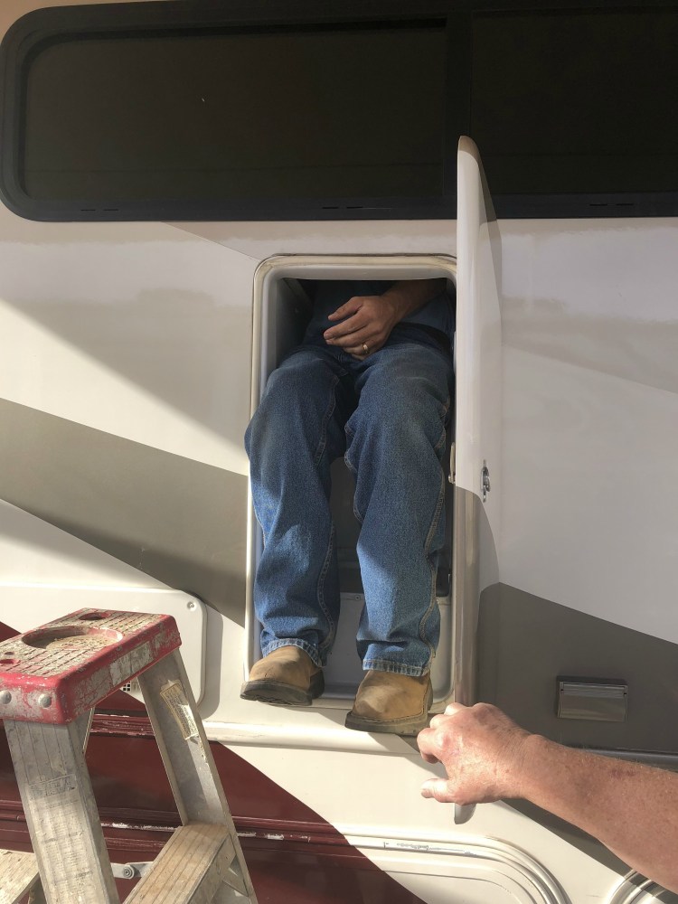 Ric remembered a man two rows over who had a rig like ours. He borrowed a key from him, but no luck. He went to the office to borrow a phone and returned with the park manager, who just happened to have a ladder. By now, we’d drawn a crowd. (Not much happens in RV parks, apparently.)
