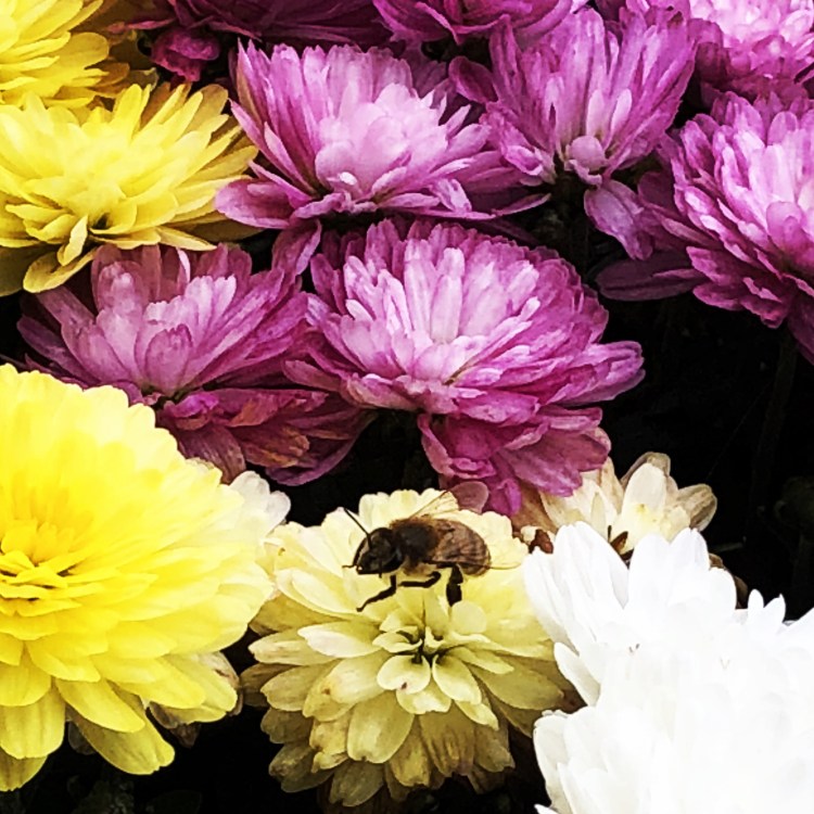 (This pot of mums sits outside the community centre, where I was surprised to find this little fellow hanging on despite the cold. That is tenacity! Image submitted for Cee’s Flower of the day.)