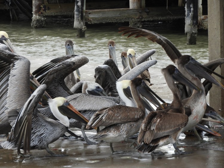 The pelicans are out in numbers, and we stop to witness the feeding frenzy at the fish cleaning station.