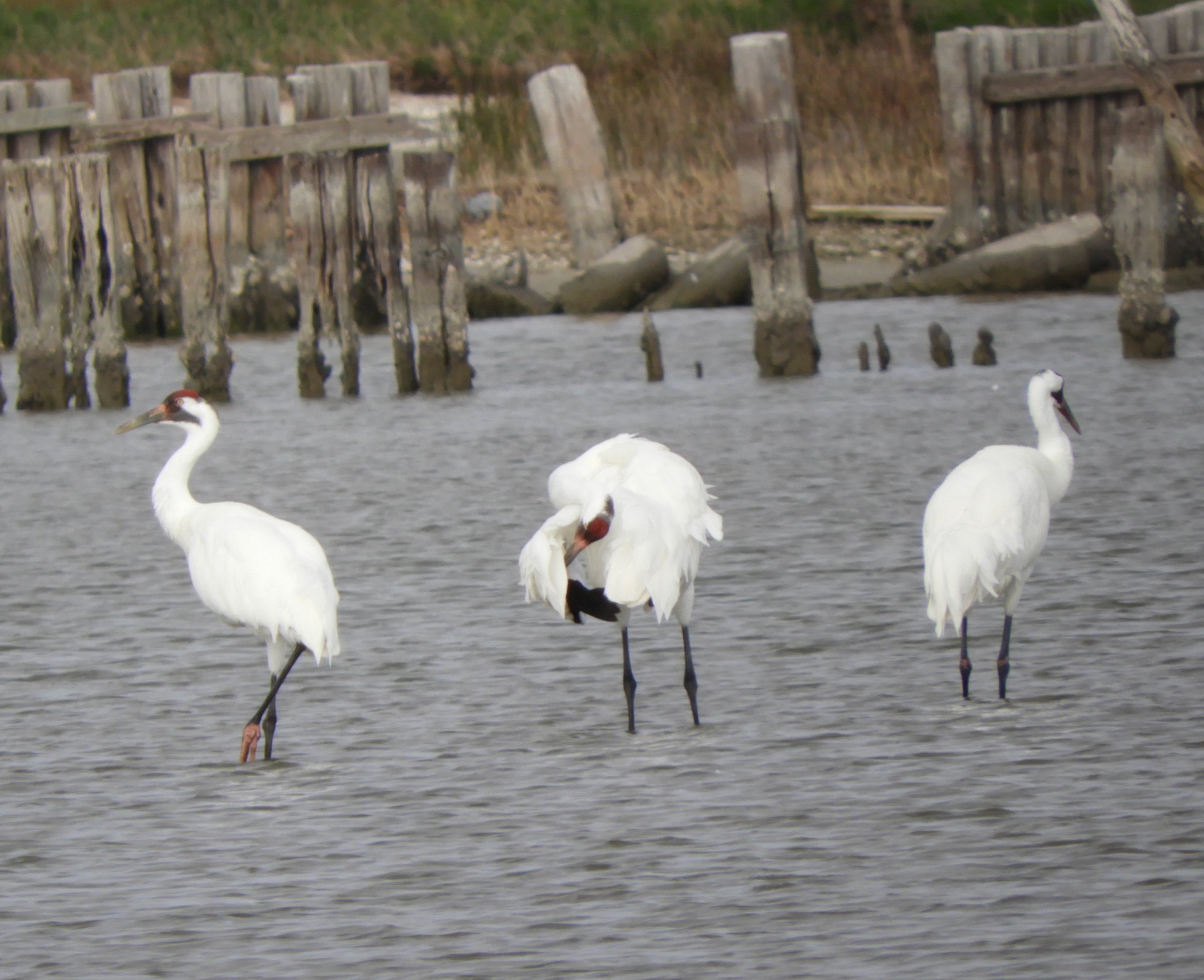He’s right about that at the shoreline, and when we get out at the crane viewing area, I hear a loud raucous – Whooping Cranes flying away.