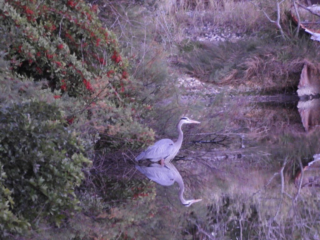 Contrasts – reds and greens – makes this Green Heron one of my favourite birds, and no doubt makes the following image so appealing: the pop of red amongst green leaves, along with the subdued tones of the Great Blue Heron, and the mirror-like stillness of the moment captured.