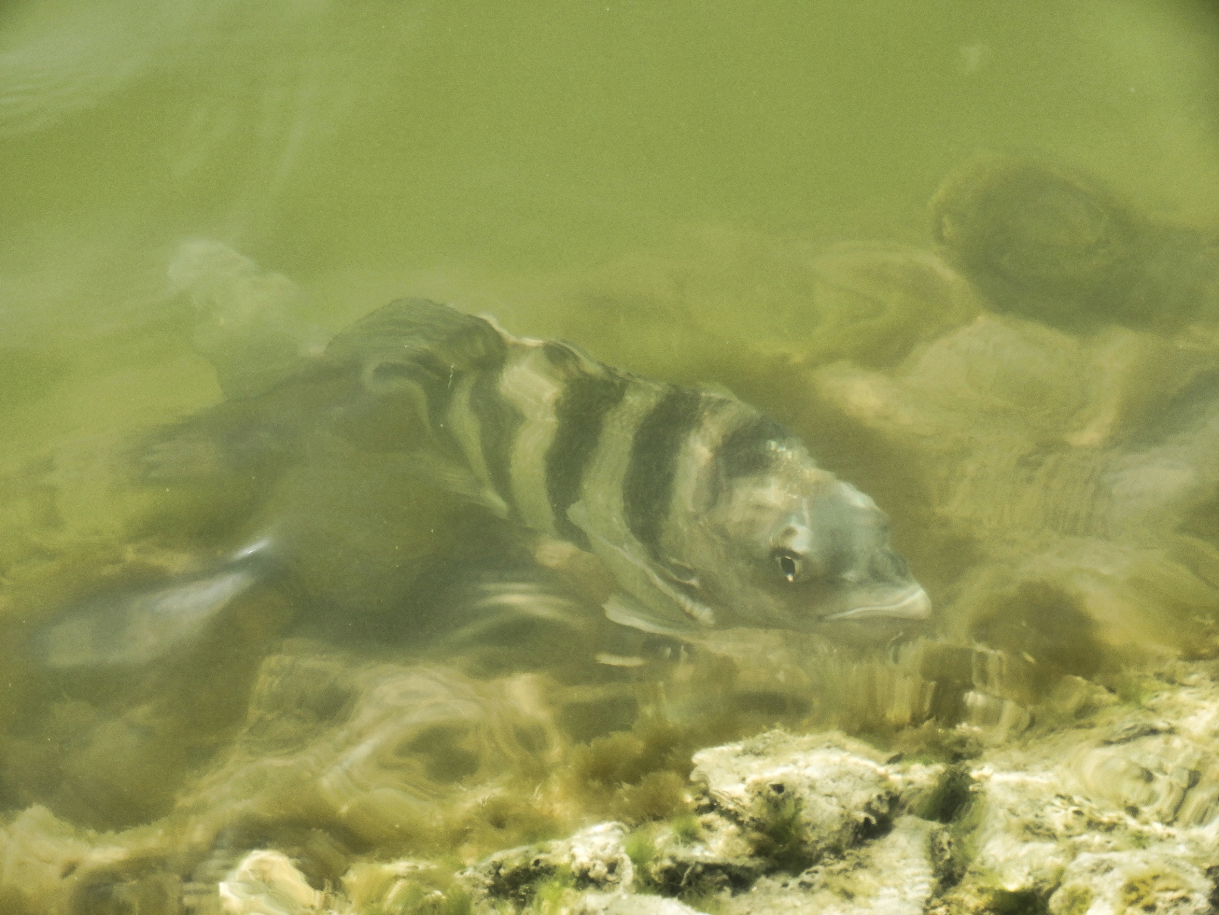 Turns out the only catch of the day is mine: a lone sheepshead grazing the mossy banks.