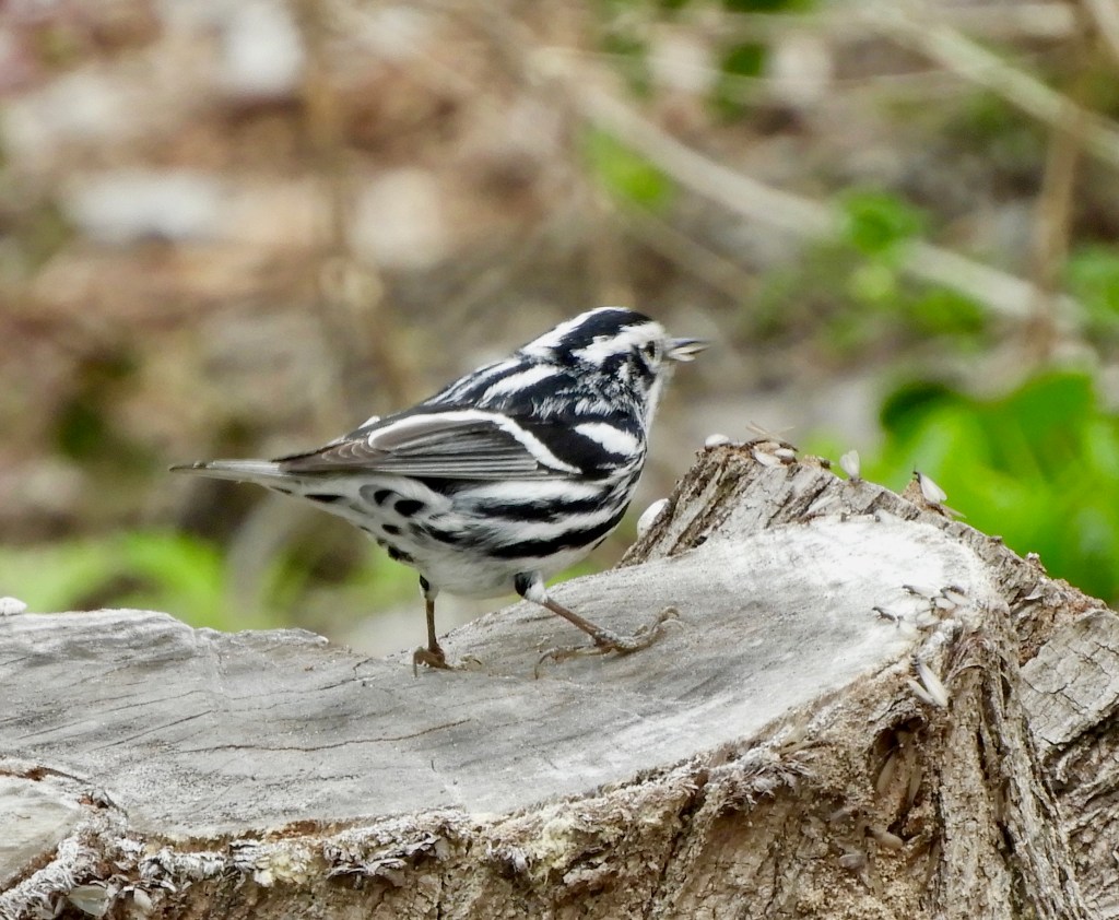 “Acts like a nuthatch,” Ric says, but I know what this is. I saw one last year, but was unable to get its photo. A Black and White Warbler!