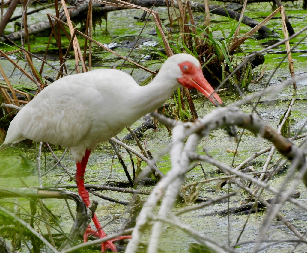 Two ibises float in and land within the thick tangle of fallen branches. The closest one to me is sporting his breeding colours. It’s exciting to be here at this time of year.