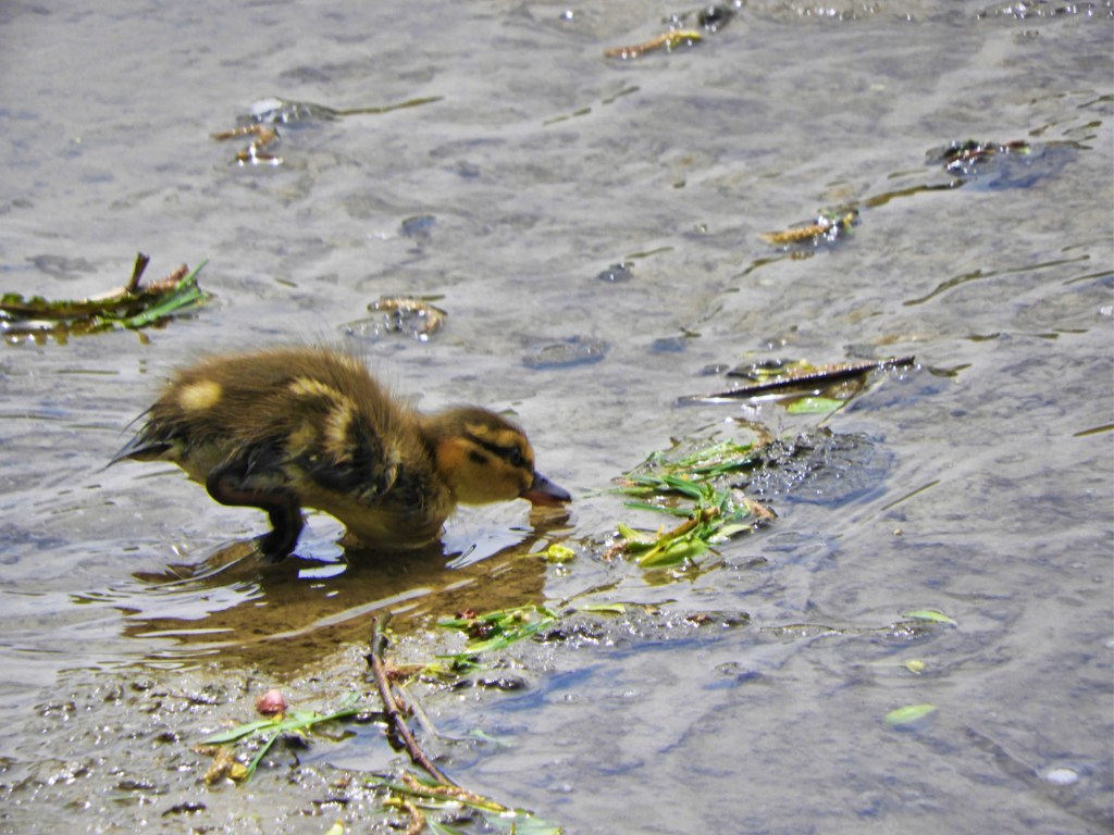 These are more of the ducklings I featured last week. The one on the right thought he’d try walking in the shallow water. Duck feet, he discovered, are awkward on land. Not sure if this dip was intentional – looked more like a face plant – but at least he came out of it with a snack.