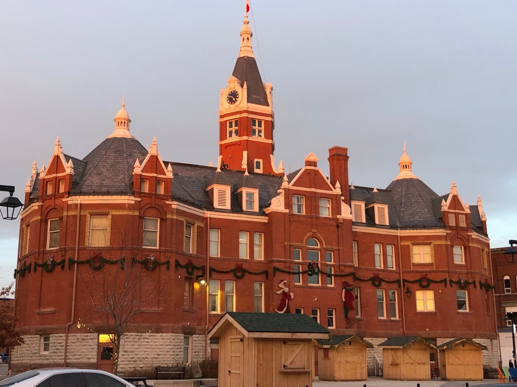 The building is a town hall. I imagine those are utility sheds for the groundskeepers – very well maintained, tourist sight.