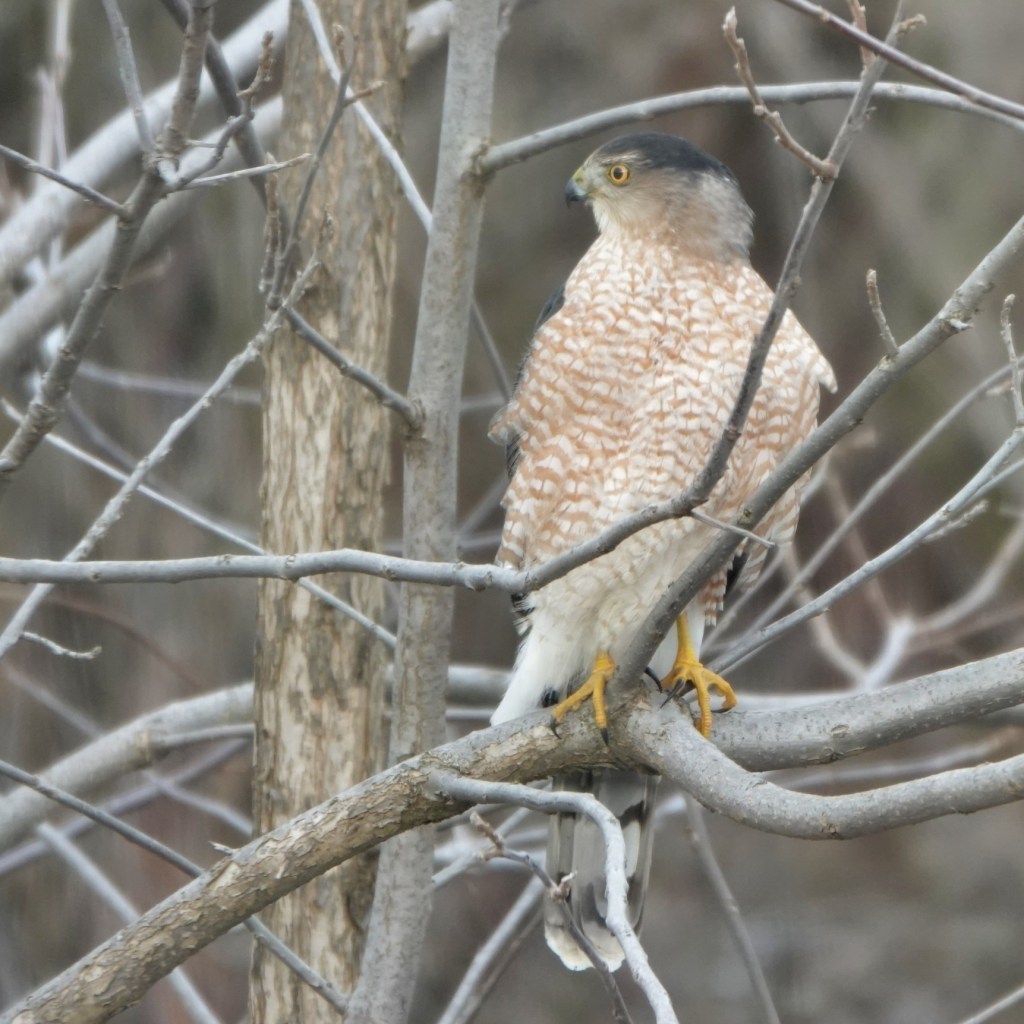 “A Cooper’s Hawk,” I yell for Ric, reaching for my camera. I’ve frightened him off, but not too far – he’s landed just at the back of the yard.