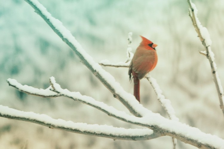 I love the red cardinal on the snow-covered branch. He looks quite self-satisfied–and rightly so!