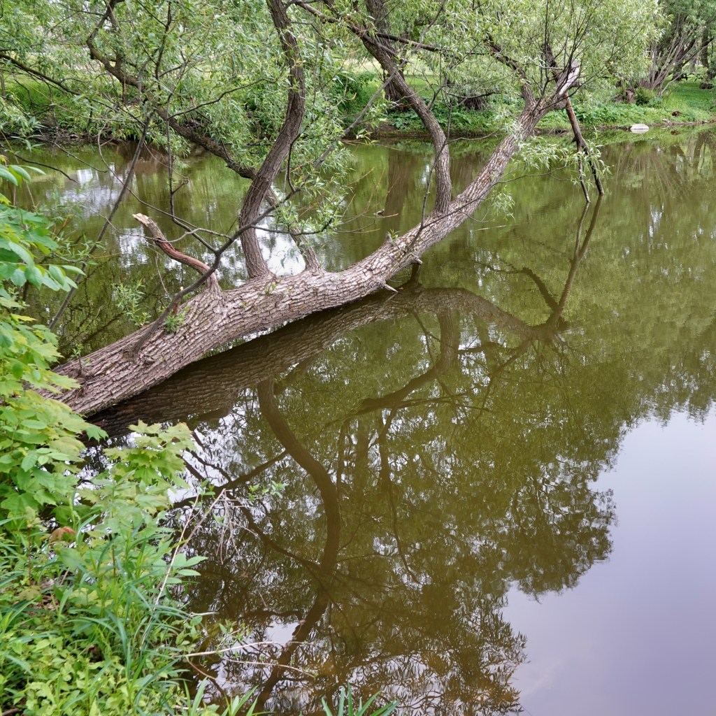 Ready for re-opening, a patio has its shades in place. A goldfinch enjoys the shade of our Walnut tree, and a fallen tree creates mystery reflected in the shadows of live trees.