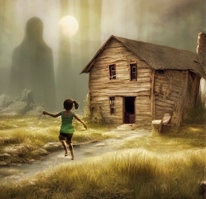 My cue to the AI app was “rickety houses”. The house needed a child, so I asked for a child skipping. Old houses have spectres. Couldn’t leave him out.